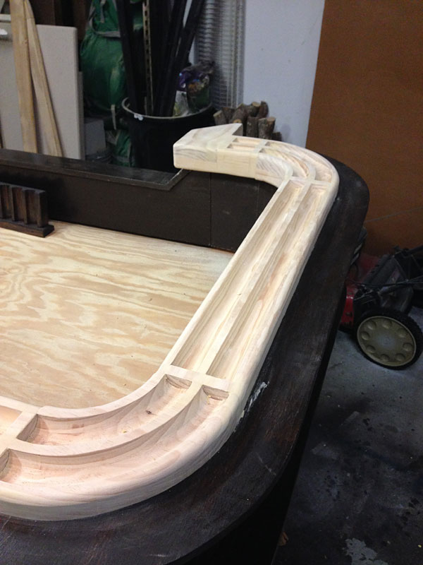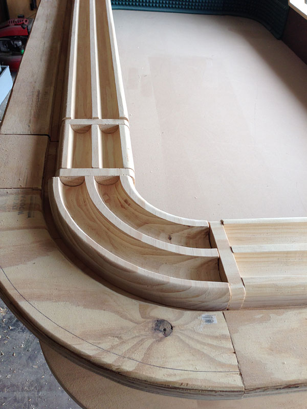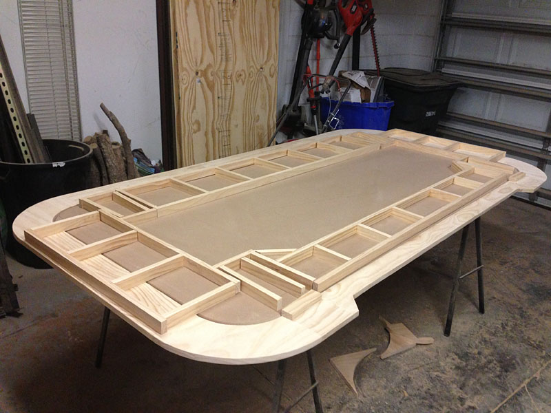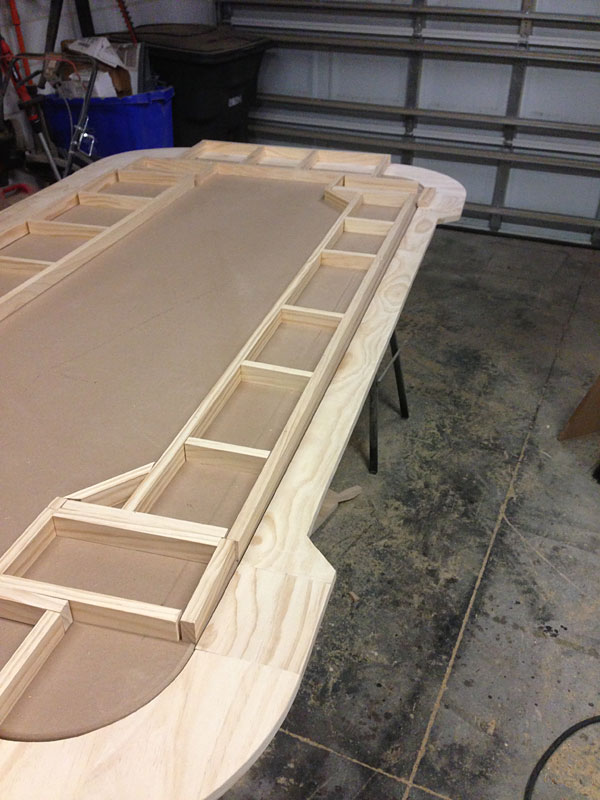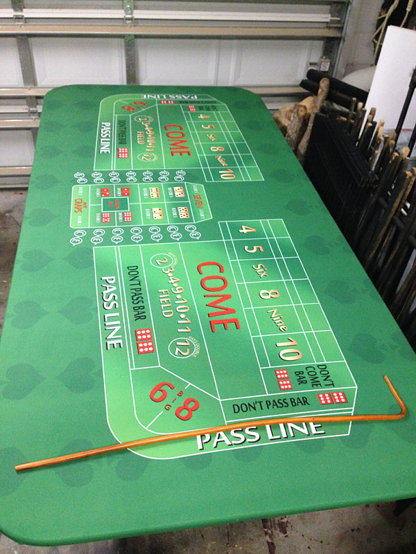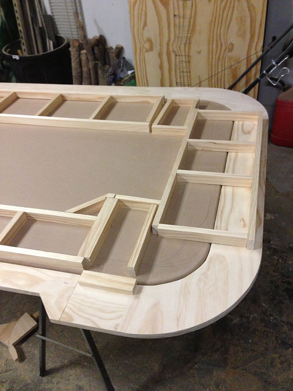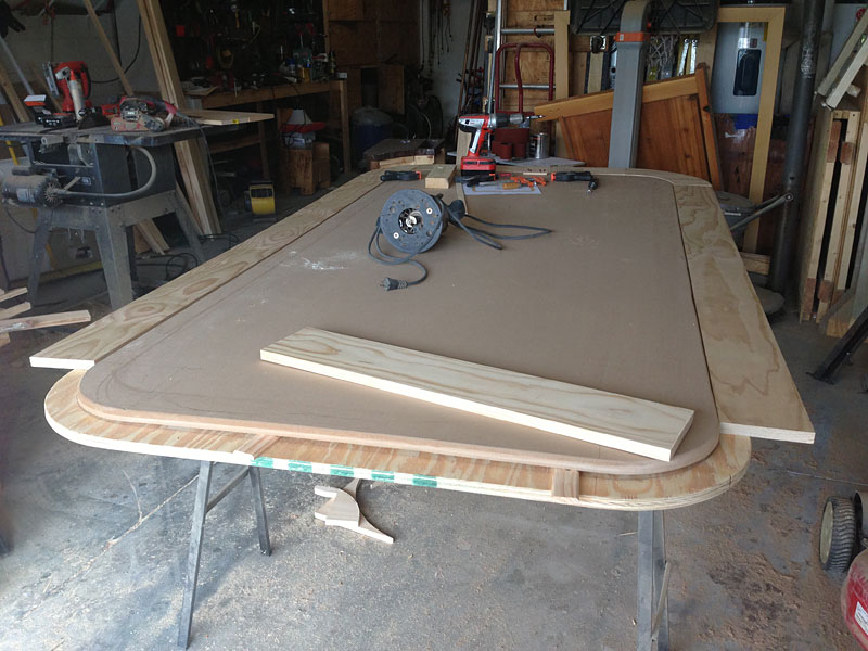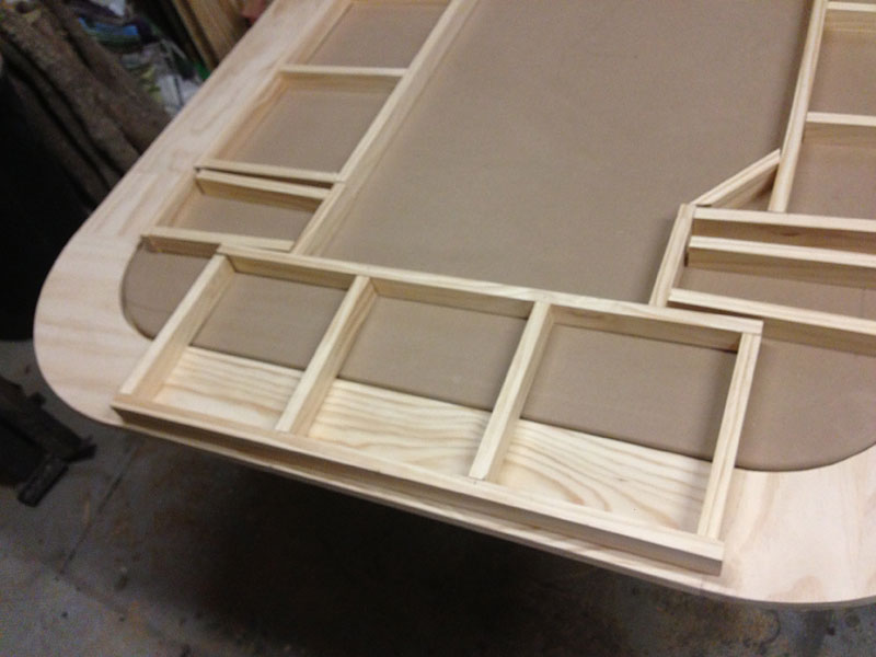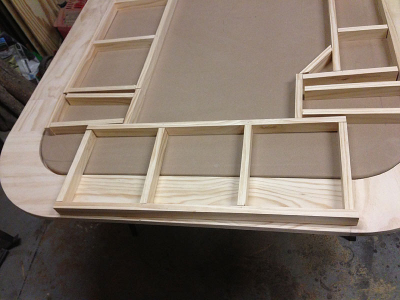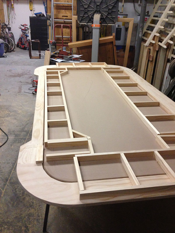 The most difficult part of this project was coming up with plans to do the build.  So few people have made one before so there wasn't a lot of references to go off of.  After spending nearly a month researching craps tables on-line we eventually made our own design for the table.  It started with the craps layout itself and using the dimensions from that the rest of the table dimensions were estimated.  From the estimates we built a 3D model for the final plan dimensions.